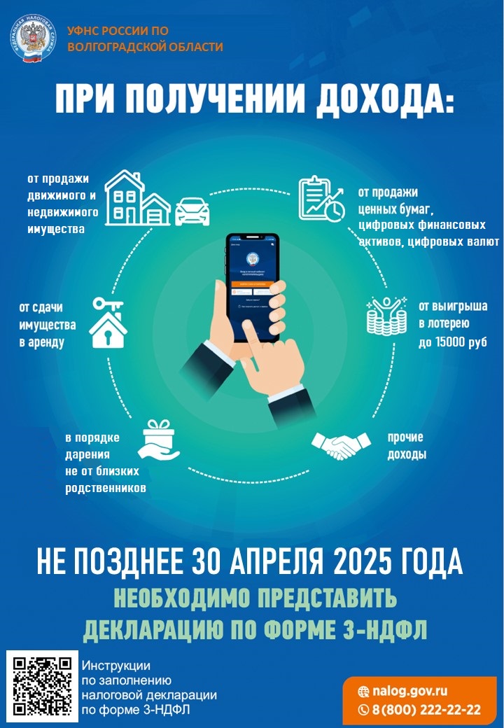 Межрайонная ИФНС России № 1 по Волгоградской области напоминает, что гражданам необходимо отчитаться о полученных доходах, если в 2024 году они продали недвижимость, которая была в собственности меньше минимального срока владения; ценные бумаги; получили подарки не от близких родственников; выиграли небольшую сумму (до 15 000 рублей) в лотерею; сдавали имущество в аренду или получали доход от источников за пределами Российской Федерации. В этом случае они самостоятельно исчисляют налог на доходы физических лиц и представляют декларацию по форме 3-НДФЛ в налоговый орган по месту своего учета.